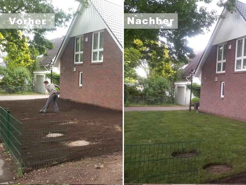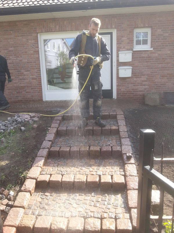 Ein Rasenfläche wurde neu angelegt. Ein Steintreppe und der Weg um das Haus wurden gepflastert.